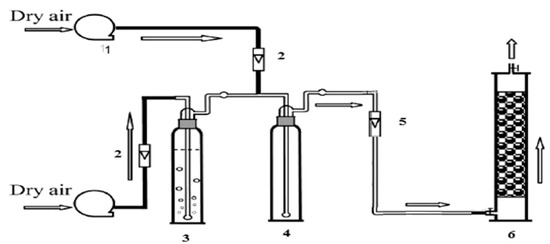 Adsorption apparatus system: (1) dry air; (2, 5) flowmeter; (3) BTEX column bubblizer; (4) mixed tank; and (6) adsorption column [93].