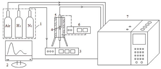 Adsorption system. (1) Feed gas; (2) display device; (3) mass flow controller; (4) stainless-steel column; (5) thermocouple; (6) temperature controller; and (7) gas chromatography [94].
