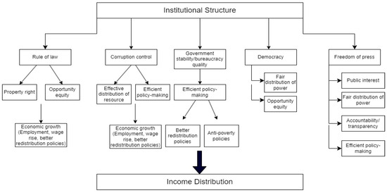 Although there are many factors that determine income distribution, it is suggested that well-functioning institutions can perform a substantial role in curbing income inequality [25]. Chong and Gradstein [24] state that countries with weak institutions are likely to have high levels of inequality along with macroeconomic problems. However, despite the potential mechanisms proposed by economics theory to explain inequality, there is little agreement among them [5]. In fact, the relationship between institutions and income distribution is quite complex, and there is no consensus on potential mechanisms [26].