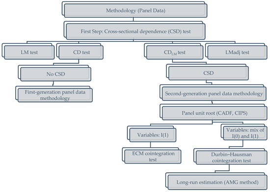 Figure 2 illustrates the econometric technique utilized, making it simpler for the readers to comprehend the methodological steps. Initially, four separate tests are conducted to scrutinize the existence of CDS. When CDS is present, first-generation econometric techniques fail to deliver dependable outcomes, necessitating the use of second-generation methods. Within the context of CDS existence, Pesaran [69]’s CADF test, a second-generation method, is utilized. If all variables are I(1), an ECM test comes into play. If there is a mix of I(0) and I(1), the Durbin–Hausman test by Westerlund [70] provides a higher level of reliability [75]. In the event of cointegration, one can proceed with long-term coefficient estimation. It should be noted that AMG, being a second-generation estimator, offers substantial benefits in identifying long-term associations [40].