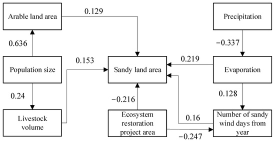 5.2. Analysis of the Driving Factors of Sandy Land Area Change from the Structural Equation Modeling Perspective