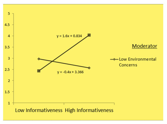 Representation of the moderating role of environmental awareness between the informativeness of a green advertisement and attitude toward green tourism (ST = 0.213 p = >0.001). This shows that environmental concerns strengthen the positive relationship between informativeness and attitude toward the green tourism.