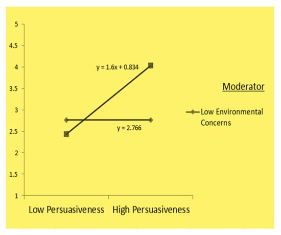 Depiction of the interacting role of environmental concerns between the relation among persuasiveness and attitude toward green tourism (ST = 0.190, p = >0.001). The results show that environmental concerns strengthen the positive relationship between persuasiveness and attitude toward green tourism.