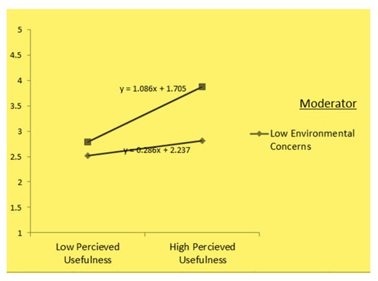 Moreover, consumers evaluate services in terms of usability and effectiveness, and the perception of a product is a crucial aspect that determines their attitudes and purchase decisions [37]. However, the perceived usefulness of a product may be reduced if advertising campaigns fail to highlight it effectively. When environmentally concerned consumers fail to find any usability in an advertisement, it can lead to negative attitudes [57]. Conversely, if a social media campaign emphasizes the positive perceived usefulness of a product, it can develop positive attitudes toward green products. The present research aimed to identify the interaction effect between perceived usefulness and consumers’ attitudes toward green and sustainable consumer behavior. Therefore, the following hypotheses were constructed: