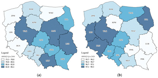 Percentage of working women in a group of economically active women in (a) 2000 and (b) 2020. DLN: Dolnośląskie; KPM: Kujawsko-Pomorskie; LUB: Lubelskie; LBS: Lubuskie; LDZ: Łódzkie; MLP: Małopolskie; MAZ: Mazowieckie; OPO: Opolskie; PDK: Podkarpackie; PDL: Podlaskie; POM: Pomorskie; WMZ: Warmińsko-mazurskie; SKL: Śląskie; SWK: Świętokrzyskie; WKL: Wielkopolskie; ZPM: Zachodniopomorskie. Source: authors’ own elaboration using Quantum GIS 2.8 Wien.