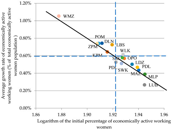 The coefficient of variation between 2000 and 2020, after a slight increase from 4.26% (2000) to 4.47% (2001), steadily decreased to almost 1.12% in 2020. The small values of the coefficient of variation indicate that the total study area, represented by 16 provinces, did not show variation. Nevertheless, it can be concluded that during the study period, sigma convergence occurred, and the area of Poland shows a lack of differentiation in terms of the studied characteristic. A confirmation of the convergence existence of the studied areas is also found in the beta convergence case. As can be seen from Figure 2, the slope of the regression line is negative, so there is convergence among the studied provinces in the period of 2000–2020. The positions of the individual provinces confirm the theoretical basis of beta convergence according to which areas with a low level of the studied characteristic (Warmińsko-Mazurskie, Dolnoślaskie, Lubuskie) tend to grow faster than the provinces with a higher initial level of the rate of working women. The study confirms the hypothesis of absolute beta convergence. A graphical representation of the relationship (Figure 2) between the average growth rate of the trait under study (vertical axis) and its initial value (horizontal axis) shows a close relationship between these variables. The results of the analysis indicate that there has been an absolute convergence of beta at the provincial level between 2000 and 2020. The provinces with a low initial value of the studied trait (percentage of working women in the population of economically active women in general) showed a higher growth rate of this trait compared to provinces with a higher initial value of the percentage of working women. The study shows that the market saturation of the female workforce is equal in the Polish provinces. This means that women are aware of their position in society and take advantage of the opportunities provided to them. Access to the labour market creates opportunities for women themselves as well as for their families. By working, they build the foundations of prosperity and self-reliance. They create opportunities to develop and educate themselves and their children. This situation contributes to the country’s sustainable development.