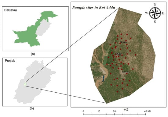 Kot Addu city is situated in the center of Pakistan, in the southern region of the Punjab Province, in the District of Muzaffargarh Figure 1. Sugarcane, wheat and cotton are the principal crops farmed in the alluvial plain that surrounds the city; rice, maize, mash, ground nuts, bajra and oil seeds (rapeseed) are cultivated in a very small ratio. Frequently, certain areas remain flooded. Mangoes, citrus, dates and pomegranates are the principal fruit trees grown; however, many citrus and mango farms also have a small amount of space for pears, dates and bananas [43]. Most of the agricultural lands in this region are mildly to moderately salinized. Kot Addu experiences mild winter and scorching summer seasons due to its desert climate. The city has encountered some of the most severe climate conditions in Pakistan. The peak temperature ever noted was roughly 51 °C (324.15 °K), and the lowest temperature ever noted was roughly −1 °C (272.15 °K). About 127 mm of rain falls every year on average (5.0 in.). Such a climate exacerbates the salinity issue; therefore, research is being conducted to track the salinity issue in this region.