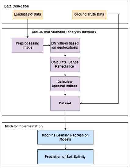 Almost 65 years ago, both color and black-and-white images were employed to identify soil salinity and gather information about various elements present on the Earth’s surface [17]. In the present day, satellite remote sensing offers a cost-effective means to explore salinization across several geographical and time spans. Remote sensing employs the reflected electromagnetic energy from the land surface to acquire data pertaining to diverse objects at varying levels of intricacy. The salinity of soil can be adequately assessed using this approach. The emergence of GIS and remote sensing techniques has provided an opportunity for technology to potentially replace or supplement traditional approaches in soil salinity assessment. In terms of predicting accuracy, employing spectral reflectance derived directly from sensors or applying spectral transformations like PCA [18,19], tasseled cap transformation [20] and spectral indices [21,22], has yielded promising outcomes. Many researchers highlight the worth of spectral reflectance in remote sensing investigations, considering it a fundamental perception in the field [23,24,25,26,27,28]. Numerous research initiatives have been dedicated to digital soil mapping, employing diverse forms of satellite data, and employing geostatistical or statistical methodologies.