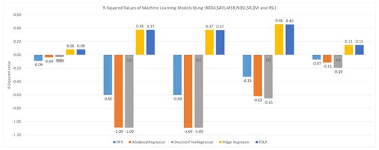 Comparison of R2 of machine learning models using spectral indices NDVI, SAVI, MSR, NDSI, SR, DVI and RSI.