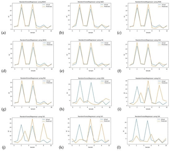 In Figure 6a–g, the predicted and actual lines using the RFR model are positioned closely together, indicating a strong alignment and accurate predictions. This finding suggests that certain spectral indices utilized in this section had lower error rates and resulted in the best model fit for predicting the salinity of soil. The close proximity of the lines in these graphs signifies that the model’s predictions closely match the actual soil salinity values, leading to more reliable results. However, a different scenario is observed in Figure 6i–l where spectral indices VSSI, SI1, SI2, SI3 and SI4 are used. In these graphs, the predicted and actual lines are more dispersed, indicating higher error rates and less accurate predictions by the RFR model. This outcome implies that, when mapping soil salinity, these specific spectral indices did not perform well in capturing the true salinity variations in the soil, resulting in less reliable predictions.