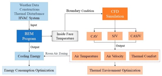 Building energy modeling (BEM) and CFD simulations have been extensively employed in numerical simulations of contemporary built environments [25,26]. However, traditional energy consumption simulation software cannot accurately consider the thermal stratification of indoor air, resulting in errors in the simulation results [27]. To address this issue, the researchers attempted to integrate BEM with CFD. This approach aimed to facilitate the exchange of essential information between the two systems, enabling more accurate results compared to using them separately [28,29]. Zhai et al. explored some effective methods for integrating BEM and CFD, such as static coupling and dynamic coupling strategies, and explain the potential of combining the two programs [30]. Zhang et al. used the coupling of the EnergyPlus model and the CFD model to optimize the thermal simulation of large buildings [31]. They found significant differences in airflow simulations between the nodal model and the coupled model. Wang et al. tried to study the performance of natural ventilation systems with EnergyPlus and CFD [32], and found that more accurate predictions can be given based on coupling strategies. Zhang et al. used the coupled simulation method to construct a framework to enhance the prediction of thermal convection on the exterior surface of buildings and optimize the outdoor convective heat transfer models in different urban communities [33]. In addition, Shan et al. combined CFD and building energy simulations to divide large spaces into multiple subregions and calculate the optimal thermostat set point for each subregion [34], showing that the coupling method can effectively provide a thermally comfortable environment in large open-plan offices.