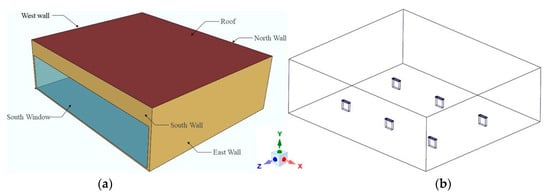 Architectural model: (a) surface definition in EnergyPlus modeling; (b) air column distribution in the CFD modeling.
