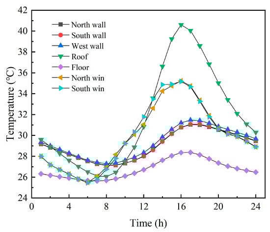First, EnergyPlus was used for an uncoupled energy consumption simulation, and the EnergyPlus model was set up in detail according to the main initial conditions provided in Table 2. According to GB 50189-2015 [45], in Class A public buildings in hot summer and warm winter areas, the heat transfer coefficient of the envelope structure shall meet the following specified limits: the roof heat transfer coefficient shall not exceed 0.8 K [W/(m2·K)], the heat transfer coefficient of the exterior wall does not exceed 1.5 K [W/(m2·K)], and the heat transfer coefficient of the window does not exceed 2.5 K [W/(m2·K)]. In this study, the heat transfer coefficient of the roof was 0.654 K [W/(m2·K)], the heat transfer coefficient of the exterior wall was 0.84 K [W/(m2·K)], and the heat transfer coefficient of the exterior window was 1.949 K [W/(m2·K)], all of which met the corresponding limit requirements. The EnergyPlus model was simulated using a full day that represents the hottest month of summer in Guangzhou. The purpose of the simulation is to predict the temperature of the inside surface of the waiting hall.
