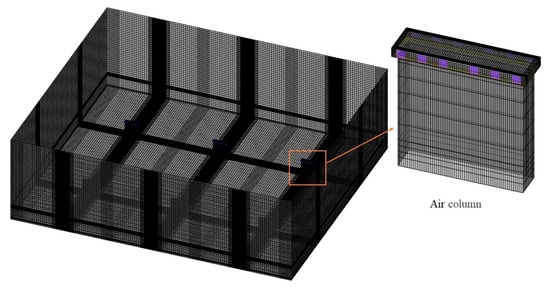 In the numerical simulation process, the model can be reasonably meshed to effectively capture the details of the flow field [46]. To balance computational accuracy and time cost, the appropriate mesh density needs to be selected based on the complexity of the problem and the limitations of computing resources. In this study, a structured grid was used to refine the grid in the air outlet area of the air column, and the grid dimensions of the side air outlet and the attached air outlet were set to 0.05 × 0.05 m and 0.05 × 0.022 m, respectively. This refinement process is depicted in Figure 5.