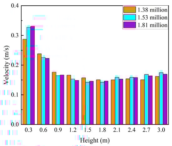 To mitigate the influence of mesh resolution on the accuracy of simulation results, three different mesh resolutions, namely 1.38 million, 1.53 million, and 1.81 million, were considered. Grid independence was assessed by comparing the velocity distribution of the three grid schemes at different heights, as shown in Figure 6. There is a notable deviation between the results obtained with the 1.53 million and 1.38 million grid schemes. On the other hand, the maximum speed deviation between the simulations conducted with the 1.53 million and 1.81 million grid schemes is 3.7%. Considering the desired accuracy of the numerical results and the computational speed, this study utilized a grid resolution of 1.53 million for the simulations.