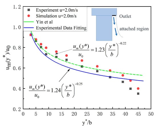 Nondimensional velocity comparison between the numerical results for the measurement data (where is the local maximum velocity at a distance of from the slot outlet, is the slot velocity, and is the width of the slot) [18].