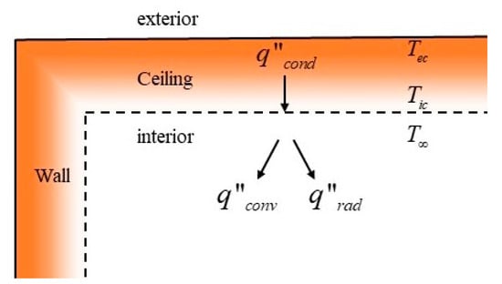 where is the thermal conductivity of the ceiling material (W/m·K), is the ceiling thickness (m), is the exterior surface temperature of the ceiling (K), is the interior surface temperature of the ceiling (K), is the interior convective heat transfer coefficient (W/m2K), is the ambient air temperature (K), is the Stefan–Boltzmann constant (W/m2K4), is the emissivity of the interior surface of the ceiling, is the temperature of each of the other surfaces (K), and is the view factor of the ceiling to other surfaces.