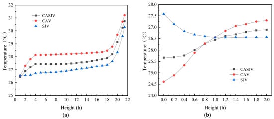Temperature distribution: (a) the average temperature variations across different height sections; (b) the average temperature variations across different height sections of the activity area.