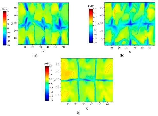 Figure 10 illustrates the PMV distribution at Y = 1.5 m for three different air supply schemes. The PMV values between −0.5 and 0.5 in most areas under the three ventilation schemes indicate good thermal comfort in the activity area of the waiting hall. Both the CASJV and CAV utilize attached ventilation, where the airflow is primarily directed towards the activity area through the adhesion effect, delivering fresh cold air. This creates an “air lake” near the ground, ensuring a comfortable environment within the activity area between ventilation columns. However, the air lake area between the air columns will feel slightly cool due to the intersection of air currents, and the PMV value is between −0.5 and −1. In the CAV, the PMV distribution is relatively uniform at Y = 1.5 m, but due to the intersection of airflows, the PMV value exceeds 0.5 in some regions. On the other hand, the CASJV, which employs side air supply, effectively addresses the load in areas distant from the ventilation column, resulting in a PMV value below 0.5 at plane Y = 1.5 m. However, the SJV exhibits the most uneven distribution of PMV values at Y = 1.5 m compared to the other two schemes. This uneven distribution may arise from the use of a single side air supply method, which can cause variations in temperature across different areas near and far from the air column.