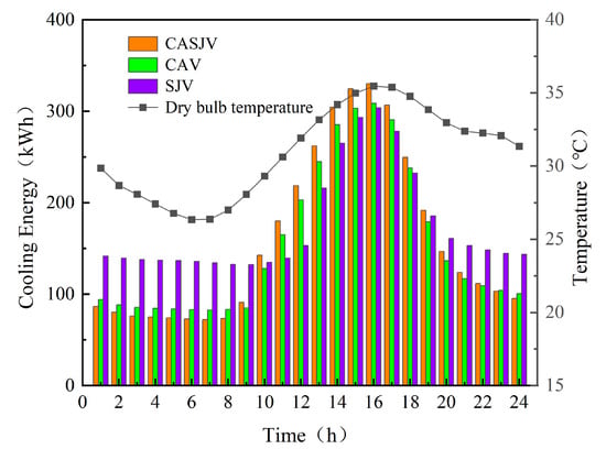 The temperature stratification data obtained from Fluent were integrated into the EnergyPlus model to calculate the cooling energy consumption for the three ventilation methods. Figure 11 depicts the hourly cooling energy consumption of the three ventilation methods on a typical day during the hottest month of summer. The three ventilation schemes exhibit a similar growth trend in cooling energy consumption throughout the day, with energy consumption increasing with rising temperatures. However, during the time periods of 0:00 to 10:00 and 20:00 to 24:00, the SJV demonstrates significantly higher cooling energy consumption compared to the other two ventilation methods. This is because in the activity area zone, SJV exhibits similar temperature distributions as the CAV and CASJV. However, in the non-air-conditioned areas, the SJV experiences lower temperatures, leading to higher cooling demands and subsequently increased cooling energy consumption. Specifically, the CAV had the lowest cooling energy consumption throughout the day, resulting in savings of 2.91% and 11.89% compared to the CASJV and SJV, respectively. Compared to the SJV, the CASJV saves 9.25% in energy consumption throughout the entire day.
