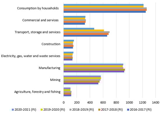 The COVID-19 pandemic has had unprecedented global impacts, leading to widespread lockdown measures, travel restrictions, and changes in social and economic activities. These measures have resulted in dramatic shifts in energy consumption patterns across many sectors. For example, Australia witnessed a substantial decrease in energy consumption of 3.6% during the 2020–2021 fiscal year, which was 5790 petajoules. These record declines in the last two years, driven primarily by the pandemic, have pushed energy consumption levels below those recorded a decade ago (5910 petajoules). In particular, the transport sector experienced the most significant reduction, with an 11% decline in energy consumption. Air transport operated at approximately one-third of the energy use levels observed two years earlier [4]. Considering the breakdown of electricity end users in selected industries, as depicted in Figure 1, based on the data from the Australian Bureau of Statistics, energy forecasting evidently plays a vital role in managing and planning energy resources. Among the selected industries, transport, storage, and services saw a notable decline in energy usage of 24.1%, reaching 465 petajoules.
