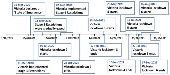 - Timeline of Every Victoria Lockdown (Dates & Restrictions), Bigaustraliabucketlist. 2021. Available online: https://bigaustraliabucketlist.com/victoria-lockdowns-dates-restrictions/ (accessed on 17 May 2023).