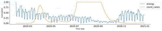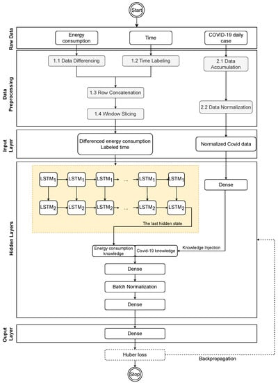 As shown in Figure 4, the proposed model contains two flows of input, namely, (i) energy consumption and labeled time and (ii) normalized COVID-19 data.