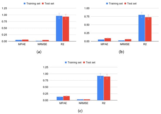 Performance of the proposed model on training and test sets in terms of three metrics: MPAE, NRMSE, and (or R2 as shown in image), on three datasets: (a) 1, (b) 2, and (c) 3.