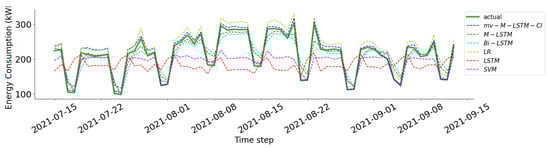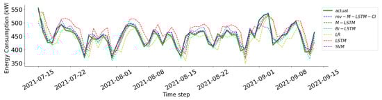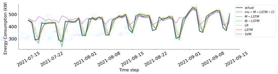 To enhance visual comparison, instead of showing line graphs for every 15 min interval, we chose to present Figure 7, Figure 8 and Figure 9. These visual representations depict the daily line graphs of the energy consumption forecasts spanning from 15 July 2021 to 15 October 2021 for 1, 2, and 3. The proposed model consistently demonstrates the highest level of accuracy and alignment with the actual data in the three datasets, as illustrated in the figures. Furthermore, the proposed model exhibits greater stability in its predictions, particularly in the challenging context of the COVID-19 period.