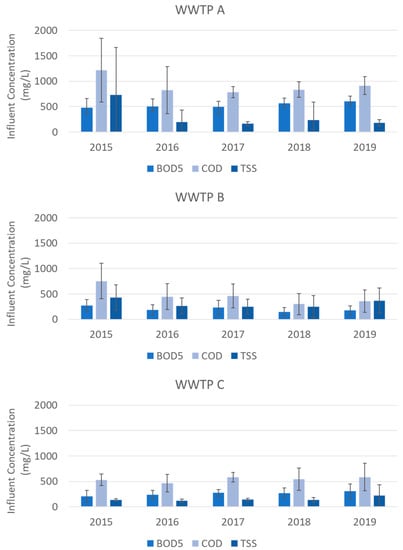 Influent BOD5, COD, and TSS concentrations in each WWTP (the bars represent the 5-year average, and the error bars the standard deviations).