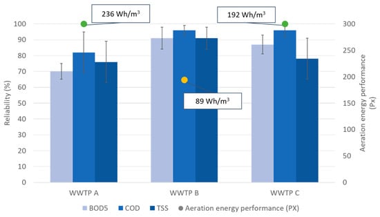 Reliability vs. aeration energy performance for each WWTP analysed (bars correspond to 5-year average reliability, error bars to standard deviations, green circles correspond to good performance, and yellow circles to acceptable performance) and corresponding measured values (Wh/m3).