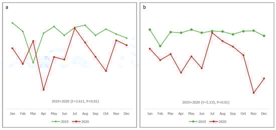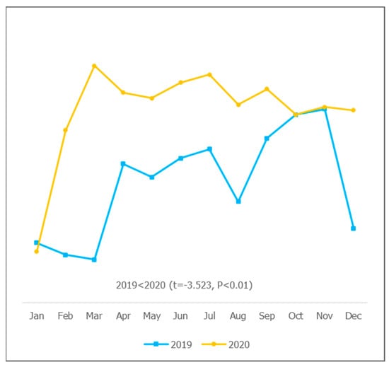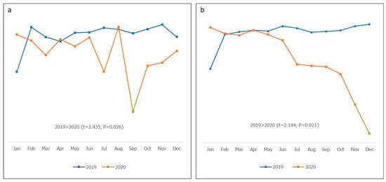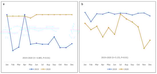 As shown in Figure 2, the planned fixed and outreach sessions in 2019 were steady, between 107% and 98%, compared to 2020, demonstrating higher fluctuations with lower values. There were significantly more planned fixed and outreach sessions in 2019 (p < 0.01). As shown in Figure 3, the proportions of working group (WG) meetings conducted and action points completed in 2019 were more progressive and stable than in 2020, and a significant fluctuation in WG meetings was observed (p = 0.026); there was also a rapid drop in action-point completion in 2020 (p = 0.021). There were significantly more M&E activities involving visits to HFs in 2020 than in 2019 (p < 0.01). Although declines were observed in 2019, the activities in 2020 showed steeper fluctuations (Figure 3). As shown in Figure 5, the vaccine supply to facilities in 2020 was significantly steadier than it was in 2019, with more than 98% timely receipt of supplies (p < 0.01). There was a significantly higher stockout in 2019 than in 2020 (p < 0.01).
