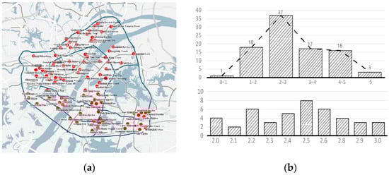 (a) Spatial Location Map of 100 Residential Block Samples in Wuhan; (b) Volume Ratio Distribution Map of 100 Residential Blocks and Distribution Map of Samples with Volume Ratios of 2–3.