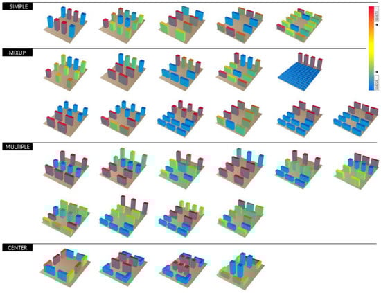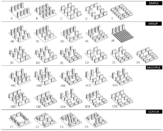 The building form induction analysis was carried out based on the summary of a sample of actual residential neighborhood cases in Wuhan, and several basic urban planning parameters were controlled within the same range in all cases in order to establish a common basis for performance comparison under the same planning conditions. In this study, 2.5 was used as the representative floor area ratio to generate the residential block types, and the simplified model plot size was set to 200 m × 250 m, i.e., 50,000 m2. The high-rise tower residential buildings were set as 27 storeys, and mid-rise towers were set as 18 storeys. The high-rise slab residential buildings were set as 20 storeys, mid-rise slab residential buildings were set as 16 storeys, small high-rise slab residential buildings were set as 10 storeys, multi-story slab residential buildings were set as 6 storeys, and villas and low-rise slab residential buildings were both set as 3 storeys. For residential neighborhoods with mixed forms, the ratio of each neighborhood form type in the total building area was set equally at 1:1:1. Residential neighborhoods in this volume ratio were created and divided into four representative urban neighborhood types (Figure 3): (1) single basic form (Simple), where the basic type was dominated by tower and slab types with different variations in height; (2) mixed form (Mixup), a two-by-two arrangement of tower and slab basic forms of different heights; (3) multiple forms (Multiple), a descending arrangement and combination of three basic forms of tower and slab of different heights by floor height; and (4) central integrated form (Center), consisting of low-rise linear buildings around the site and high-rise tower or slab buildings in the center of the site.