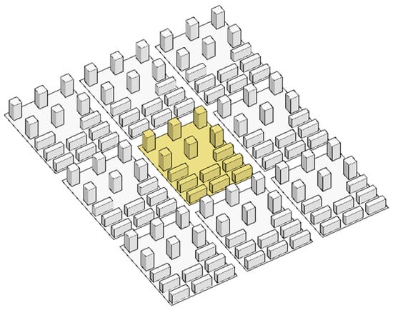 To theoretically test the performance of a given urban form in a homogeneous urban environment, the actual urban situation was simulated in an upper and lower block environment consisting of a 3 × 3 array of the same urban block type (Figure 4). Thus, in this scenario, the influence of the city block at the center of the array on its neighboring blocks, which was highlighted in Figure 4 in yellow, was “mirrored” back to the site and reflected in its own overall representation. The plot spacing was set to 30 m, representing the width of a typical neighborhood road. The left and right setback distances between the buildings and the site boundary were set to 5 m.