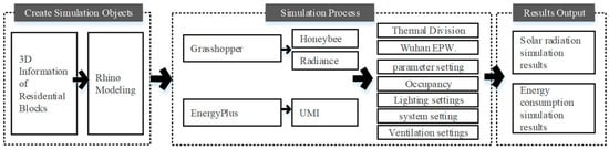 As for the workflow, Google satellite maps were used to capture neighborhood contours and patterns, and then a 3D neighborhood model of the city was built in Rhino using research measurements, integrated with the Ladybug plug-in and Honeybee tool on the Grasshopper parameterization platform. The Grasshopper platform and radiance computational engine were invoked to perform solar radiation simulations on the 3D model in Rhino []. This radiation simulation method was able to integrate building size, orientation, and relevant details, such as ground and adjacent building reflections, to obtain realistic radiation values for the block roof and each façade in the case model. In the energy consumption simulation, the UMI platform was adopted to input regional climate conditions, building envelope construction parameters, system lighting, equipment operating hours, and personnel activities through research and code review to simulate the energy consumption of the completed 3D model and derive the total energy consumption load of the neighborhood building. The above processes are shown in Figure 5.