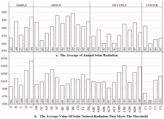 The above describes the average level of natural radiation reception in each neighborhood. Considering the large variation in natural radiation, the magnitude of the average radiation in each neighborhood that met the threshold needed to be considered to assess the actual solar power potential of each neighborhood. As shown in the graph of the average radiation of the portion of each neighborhood that met the threshold, a large difference could be discovered in the trend of the average radiation of each neighborhood that met the threshold and the average natural radiation. As shown in the graph, the overall average radiation ranged from 960 to 1060 kWh/m2*y. Block E had the highest average radiation of 1063.5 kWh/m2*y. Block C2 reached the lowest radiation, with an average radiation value of 960.3 kWh/m2*y. From this graph, it could be observed that the average radiation value of the part meeting the threshold was much larger than the threshold standard, reflecting the nonlinear distribution of the overall radiation.