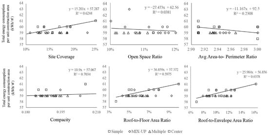 According to the results of the scatter plots and regression analysis of the 30 cases of planning geometric parameters and total energy intensity per unit of floor area in the neighborhood, as shown in Figure 8, site coverage, compacity, and the roof envelope area ratio were relatively the most significant influencing factors on the total energy intensity, with each influencing parameter having a variance of slightly more than 60%, followed by the roof-to-floor area ratio (59.7%), while other planning geometric parameters, such as the open space ratio and Avg APR, showed lower correlations with the total energy intensity of the neighborhood. This suggested that, in the design of urban residential neighborhoods under the same planning conditions, types with relatively higher site coverage, roof-to-floor areas, and GFA ratios might realize greater energy-saving potential under the same circumstances (considering building shading) (Figure 8 and Figure 9).