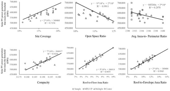 Regression analysis of the radiation data and the selected morphological parameters for each neighborhood meeting the threshold was performed, and the results are shown in the following figure. The results showed that four of the six indicators showed strong correlations with the solar radiation that met the threshold, and their degrees of correlation were more than 90%. Among them, the open space ratio, roof-to-floor area ratio, and roof-to-envelope area ratio were the indicators most correlated with the radiation data, with R2 values of 0.9911, 0.9875, and 0.9945, respectively. The correlation coefficients between the other two indicators, building density and floor area-to-perimeter ratio, and the radiation data meeting the threshold were 72.54% and 29.78%, respectively. Meanwhile, except for the open space and floor area-to perimeter ratios presenting negative correlations with the radiation data, the remaining four indicators displayed positive correlations. From the above data analysis, it could be found that the correlation between the building roof, as an important receiving surface of solar radiation, and the radiation data that met the threshold value was the most significant.