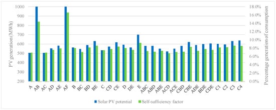 In order to further determine which residential block type had the best energy efficiency, a comparison of the self-sufficiency factor was performed. The AF case type (high-rise tower + villa) had the best energy-saving potential, which was attributed to the advantage of less mutual shading between buildings and the largest building roof area ratio (49.4%), providing the strongest potential for installing solar PV panels. However, due to the policy guidance of highly intensive land use in China, this block type is not recommended for development in urban centers. This result was followed by the comprehensive energy-saving potential of the AB type, while the E and CBE types were in third and fourth places respectively, with a large gap fall (Figure 11).