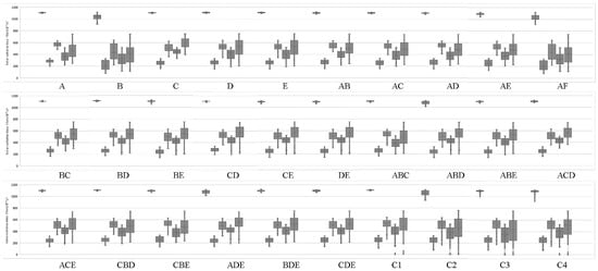 The average radiation values considering the threshold case were compared and analyzed. From Table 8, it could be found that both combined block cases exhibited the highest average radiation in both natural radiation acceptance and threshold-meeting radiation reception, with 188.00 and 55.00 kWh/m2*y per unit of land area, respectively. For the natural radiation-receiving amount, the enclosed type had the lowest average radiation amount, with 164.05 kWh/m2*y per unit land area. In the comparison of radiation averages that satisfied the threshold, the single form neighborhood case reached the lowest average radiation with only 44.74 kWh/m2*y per unit of land area. In the graph of natural radiation reception, it could be seen that the data for single form cases, three types of styles, and the enclosed style were more stable. The difference between the data for two types of cases was large, in which the radiation per unit land area of the AB type neighborhood reached 316.58 kWh/m2*y, which was the highest radiation intensity among all cases. In second place was the AF case, with a radiation value of 267.23 kWh/m2*y. In the threshold control case, the AF block had the highest radiation performance with 130.37 kWh/m2*y per unit land area, which was the highest among all block cases.