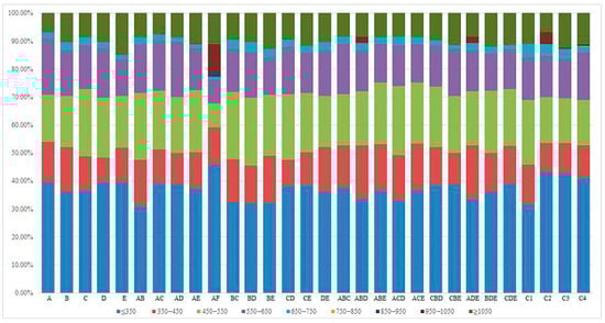Considering the non-uniformity of radiation distribution, the percentage of radiation in different ranges in each block was counted. As shown in the figure below, the overall radiation exposure was mainly concentrated in the neighborhoods. On the whole, the dwelling radiation was mainly concentrated below 350 kWh/m2*y. The radiation was the least distributed within 650–1050 kWh/m2*y. The part with radiation greater than 1050 kWh/m2*y accounted for the second largest proportion. It could be seen that the part with the average radiation value meeting the threshold mostly satisfied >1050 kWh/m2*y, and the radiation in this part mainly came from the roof, which, therefore, made a great contribution to the PV power generation system.
