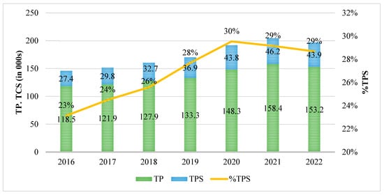 Publications trends. Note: TP—total publications; TPS—total publications mapped to SDGs.