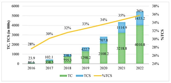 Citations trends. Note: TC—total citations; TCS—total citations from publications mapped to SDGs.