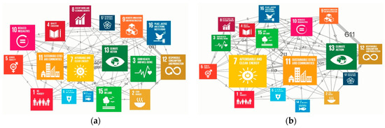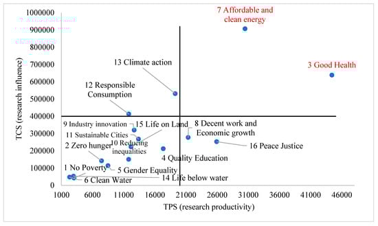 According to the research productivity (TPS) and research influence data (TCS) shown in Figure 4, the SDGs with the highest productivity and the highest influence are SDG 3 (Good Health and Well Being) and SDG 7 (Affordable and Clean Energy). The SDGs with high productivity but low influence include SDG 16 (Peace, Justice, and Strong Institutions) and SDG 8 (Decent Work and Economic Growth). The SDGs with low productivity but high influence include SDG 13 (Climate Action) and SDG 12 (Responsible Consumption and Production). The SDGs with low productivity and low influence include SDG 11 (Sustainable Cities and Communities), SDG 9 (Industry, Innovation, and Infrastructure), SDG 15 (Life on Land), SDG 12 (Responsible Consumption and Production), SDG 10 (Reduced Inequalities), SDG 5 (Gender Equality), SDG 2 (Zero hunger), and SDG 1 (No Poverty).