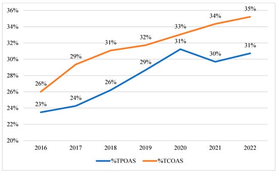 Trends of SDGs mapped open access publications. Note: TPOAS—Total publications in open access mapped to SDG; TCOAS—Total citations from publications in open access mapped to SDGs.