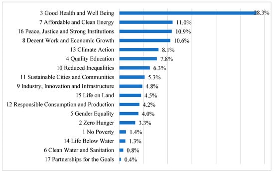 Ref. [29] explored the current state of affairs regarding SDG reporting. Their study found that only large companies from developed countries are focused on existing studies, including three levels of reporting: firm level, report level, and regulation level. Ref. [29] further noted that report-level determinants are within the business’s control, while firm and regulation levels are beyond such control. Ref. [30] developed a research assessment tool to evaluate the association between management research and the 17 SDGs. Their study found eight core themes within the SDG framework: sustainable development, governance, vulnerable populations, water, gross domestic product (GDP), food security, restoration, and public health. Their study further found that only 10.6% of business research published in FT 50 journals in 2019 directly addresses SDGs, with 24.5% having an indirect association with SDGs.