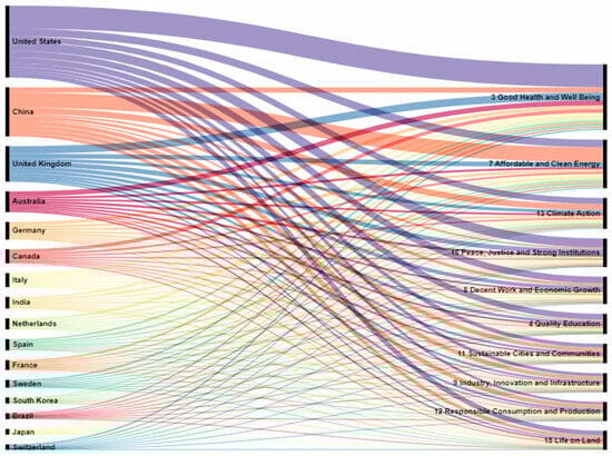 The United States, China, United Kingdom, Australia, and Germany have the most publications mapped to the Sustainable Development Goals (SDGs) according to the Sankey diagram in Figure 7. Among these countries, SDG 3 (Good Health and Well Being), SDG 7 (Affordable and Clean Energy), SDG 13 (Climate Action), SDG 16 (Peace, Justice, and Strong Institutions), and SDG 8 (Decent Work and Economic Growth) are the most commonly mapped. On the other hand, SDG 9 (Industry, Innovation and Infrastructure), SDG 12 (Responsible Consumption and Production), and SDG 15 (Life on Land) are the least commonly mapped.