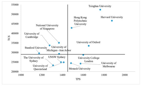 The research productivity (TPS) and impact (TCS) of highly productive institutions contributing to SDG research are shown in Figure 8. Harvard University (United States), Tsinghua University (China), Hong Kong Polytechnic University (China), and the University of Oxford (United Kingdom) have the highest TPS and TCS values among the listed institutions. University College London (United Kingdom) and the University of Melbourne (Australia) have high research productivity, but their publications have fewer citations when compared with Harvard University and Tsinghua University. NUS (Singapore), Cambridge (United Kingdom), and Stanford (United States) have high research impact and lower research productivity. Australia is the leading country with five top institutions, followed by the United States and the United Kingdom with four institutions each.