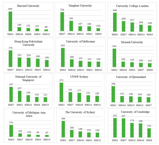 Figure 9 shows the leading universities whose publications are mapped to SDGs. Harvard University has SDG 3 as the top researched SDG. Tsinghua University and Hong Kong Polytechnic University have SDG 7 as the most researched SDG. Among the high potential institutions that are highly cited but less productive, the National University of Singapore is found to be more productive in SDG 7. In contrast, SDG 3 is the prime research focus for the University of Michigan-Ann Arbor and the University of Cambridge. Stanford University is missing. These institutions can be on the list of highly productive and impactful institutions if they keep working like this by increasing their productivity rate without compromising their keen emphasis on impact. Among the highly productive but less impactful institutions, the University of Melbourne, University College London, and Monash University all keep SDG 3 as their highest SDG focus. Three Australian institutions, namely UNSW Sydney, The University of Sydney, Queensland University, etc., are heading towards the highly productive but less impactful category from their current status of less productive and less impactful institutions. Interestingly, all these institutions also have SDG 3 as their prime focus.